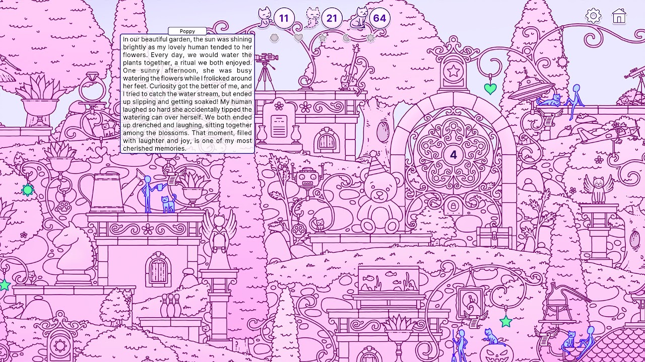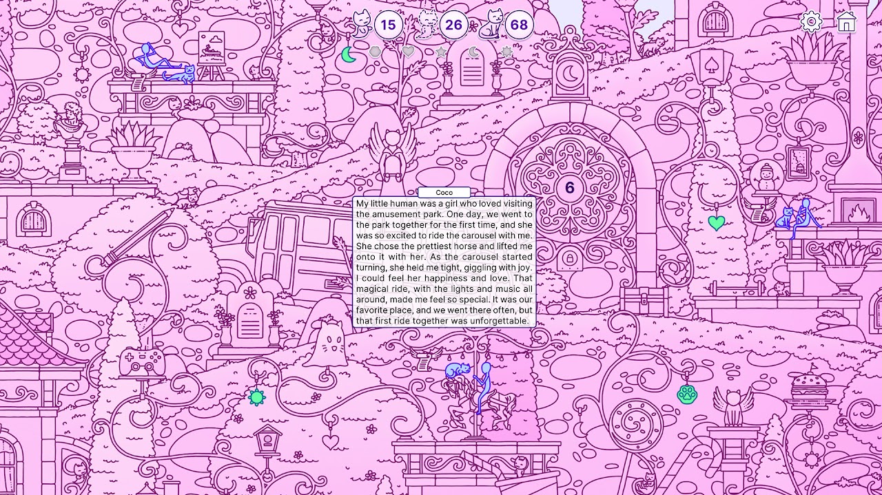 Hidden Cat Memories is an exciting 2D hidden object game with handcrafted graphics where you search for lost souls of kitties in a surreal, fantasy world. As you find each lost soul, it transforms into a normal kitty that you must discover again. Each encounter allows you to unlock and relive its favorite memory with its human in life.